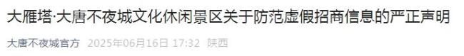 今天,大唐不夜城官方微信公众号发布声明,指出近期发现有机构或个人冒充街区官方名义,在网络平台发布大雁塔·大唐不夜城文化休闲景区的虚假招商信息,严重扰乱了市场秩序。为保护广大商户权益及良好营商环境,特此声明。