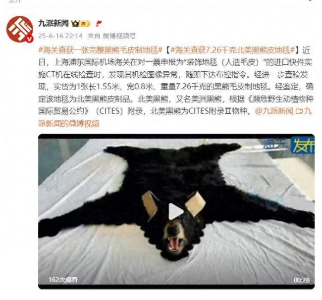 海关查获7.26千克北美黑熊皮地毯 实为濒危物种制品。近日,上海浦东国际机场海关在检查一票申报为“装饰地毯(人造毛皮)”的进口快件时,发现其机检图像异常。随后下达布控指令,进一步查验后发现,实货是一张长1.55米、宽0.8米、重量7.26千克的黑熊毛皮制地毯。经鉴定,确定该地毯为北美黑熊皮制品。北美黑熊,又名美洲黑熊,属于《濒危野生动植物种国际贸易公约》(CITES)附录Ⅱ物种。