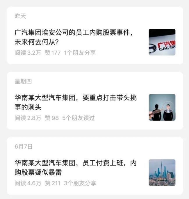 目前尚没有官方媒体对此进行报道,但飞灵汽车注意到,早在6月7日,有专注于汽车技术的自媒体突然发布了名为《华南某大型汽车集团,员工付费上班,内购股票疑似暴雷》的帖子,该帖子中提到的华南某大型汽车集团被读者指出极可能是广汽,而所涉及的对象也就是埃安。而后接连几天,该自媒体一直持续爆料,分别在6月12日和6月15日一直曝光该事件的进展。特别是在6月15日,其直接点名了,题目为《广汽集团埃安公司的员工内购股票事件,未来何去何从?》。