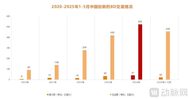 图3.2020-2025年1-5月中国创新药BD交易数据(数据来源医药魔方,动脉网制图)