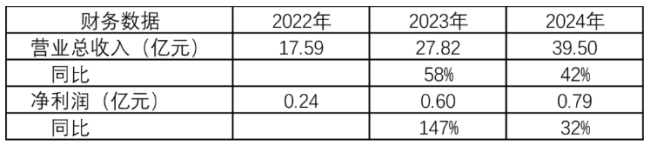 2022年-2024年,公司营业收入分别为17.58亿、27.82亿、39.50亿,净利润分别为0.24亿、0.60亿、0.79亿,均保持较快的增长速度。