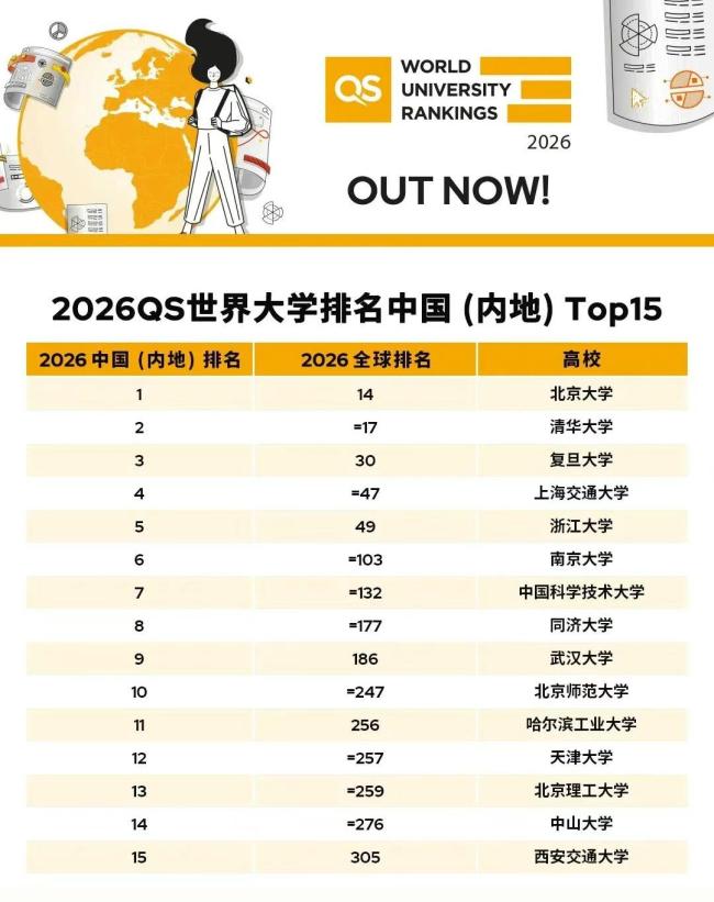 6月19日,全球高等教育分析机构QS Quacquarelli Symonds发布了2026年QS世界大学排名。此次排名收录了来自106个国家和地区的1500多所大学。麻省理工学院连续第14年位居榜首,北京大学和清华大学跻身全球前20名,显示了全球高校竞争的激烈程度。约45%的中国内地大学相较去年排名有所提升,延续了近年来中国高校在国际排名中不断攀升的趋势。