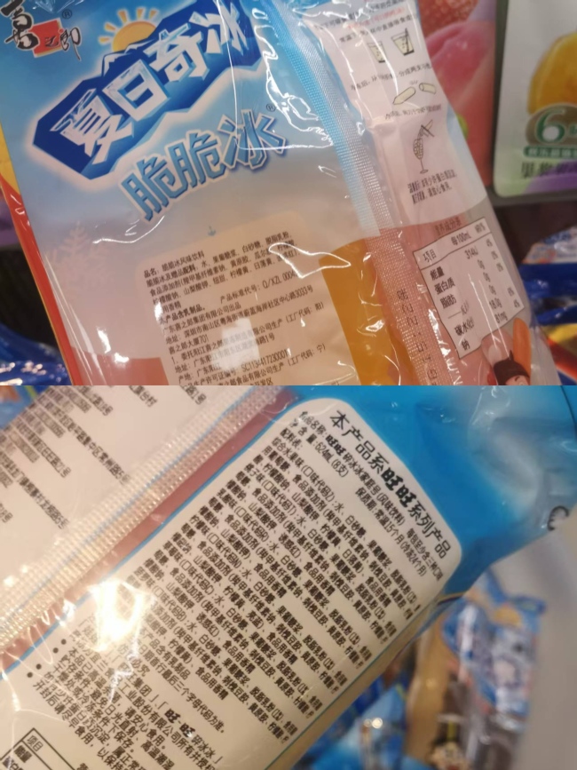 另外,旺旺的碎冰冰家庭装中的配料含有多种合成色素。其综合水果味产品含有柠檬黄、日落黄两种。桃子味含有诱惑红;柠檬味含有柠檬黄、亮蓝;草莓味含有诱惑红;菠萝味含有柠檬黄。