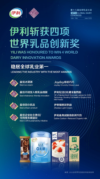 大会首日,主办方正式揭晓2025年度世界乳品创新奖(World Dairy Innovation Awards)获奖名单。伊利集团凭借卓越创新实力强势出击,一举斩获最佳冰淇淋、最佳匠心乳品、最佳企业社会责任/可持续发展倡议、最佳不耐受人群乳品创新等四项世界乳品创新奖及六项推荐奖,产品覆盖液态奶、冰淇淋、奶粉、稀奶油等多个品类,获奖数量位居全球乳业第一。值得关注的是,伊利已连续6年斩获世界乳品创新奖。