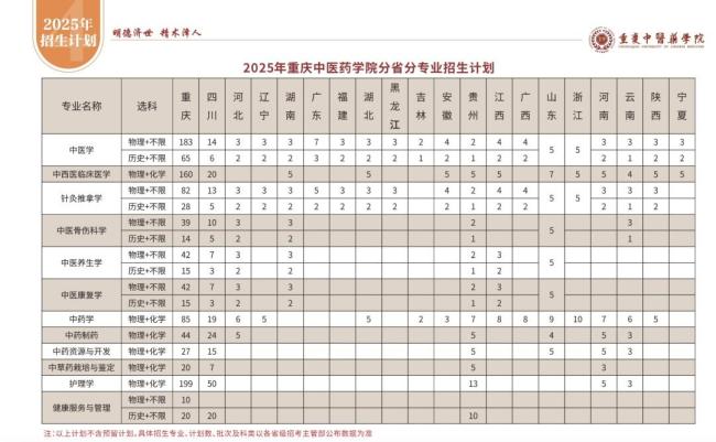 近日,全国各地高校陆续发布了2025年招生章程,不少高校调整了招生计划。重庆中医药学院发布的2025年招生章程显示,该校将招收中医学、中西医临床医学、针灸推拿学、中医骨伤科学、中药学、中药制药、中医康复学、中医养生学、中药资源与开发、护理学、健康服务与管理、中草药栽培与鉴定共12个专业,比去年增加了一个专业,即中草药栽培与鉴定。