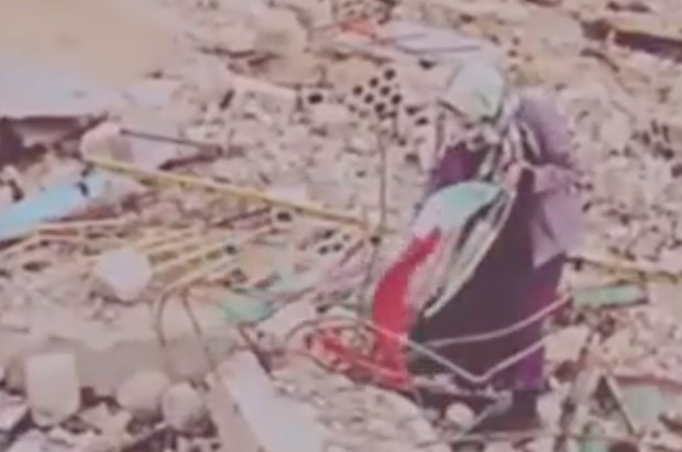伊朗驻华使馆:女子在废墟中高高扬起伊朗国旗