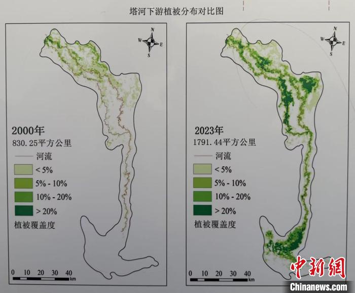 塔里木河下游植被分布对比图。中新社记者 马鸾宇 摄