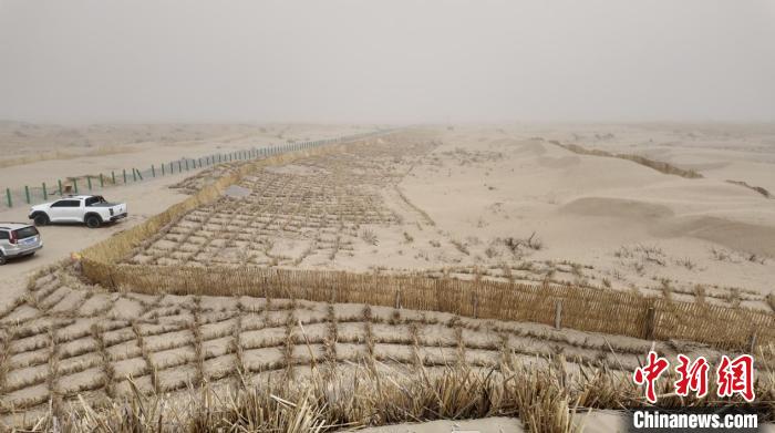 站在工程区域内的沙丘上,记者看到,草方格和高立式沙障纵横交错,即使狂风肆虐,沙障周边的黄沙依然保持“平静”,被牢牢“钉”在原处。