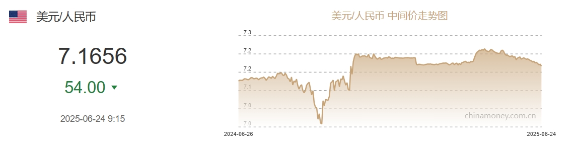 中新网6月24日电 据中国外汇交易中心网站消息,中国人民银行授权中国外汇交易中心公布,2025年6月24日银行间外汇市场人民币汇率中间价为:1美元对人民币7.1656元,上调54个基点。