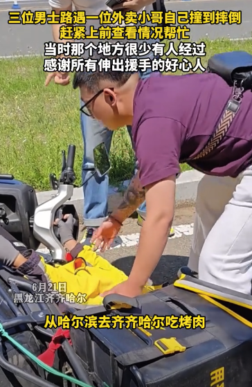 外卖小哥不慎摔倒 三位男士伸出援手