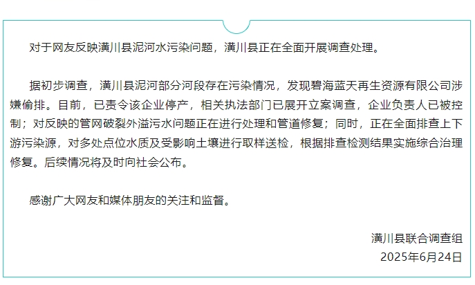 据初步调查,潢川县泥河部分河段存在污染情况,发现碧海蓝天再生资源有限公司涉嫌偷排。目前,已责令该企业停产,相关执法部门已展开立案调查,企业负责人已被控制;对反映的管网破裂外溢污水问题正在进行处理和管道修复;同时,正在全面排查上下游污染源,对多处点位水质及受影响土壤进行取样送检,根据排查检测结果实施综合治理修复。后续情况将及时向社会公布。
