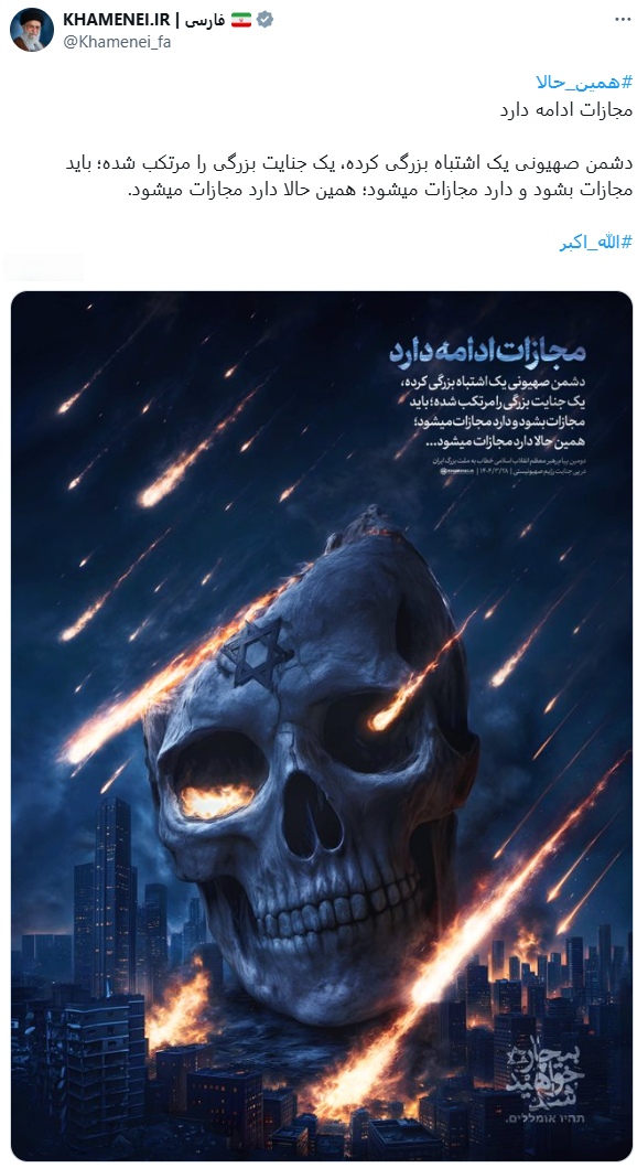 德黑兰当地时间6月23日早上,社交媒体平台X上的账号@Khamenei_fa发布了一条帖文:“惩罚仍在继续。‘犹太复国主义敌人’犯下严重错误,犯下滔天罪行;它必须受到惩罚,而且现在正在受到惩罚。” 帖文还配有一张计算机合成的图片,显示一座城市在夜间受到袭击多处起火,一颗巨大的骷髅头上印有大卫之星,远处是硝烟滚滚的天际线,导弹正从空中倾泻而下。
