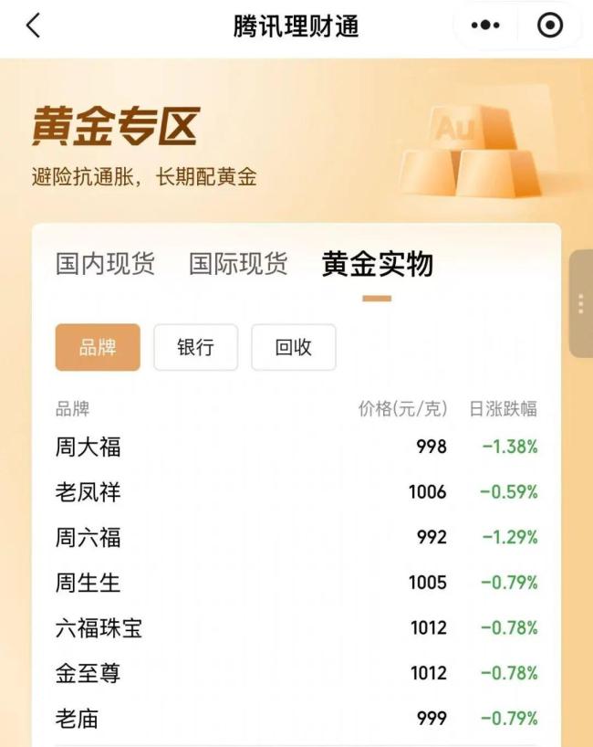 25日,国内金饰价格普遍下跌,单克价格纷纷降至千元附近。周大福足金价格降至998元/克,较前一日下跌14元;老庙黄金价格为999元/克,较前一日下跌8元;老凤祥的价格为1006元/克,较前一日下跌6元;周生生金饰价格为1005元/克,较前一日下跌8元。