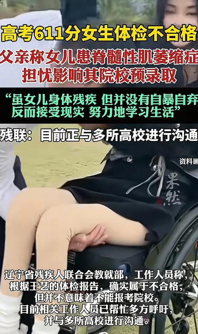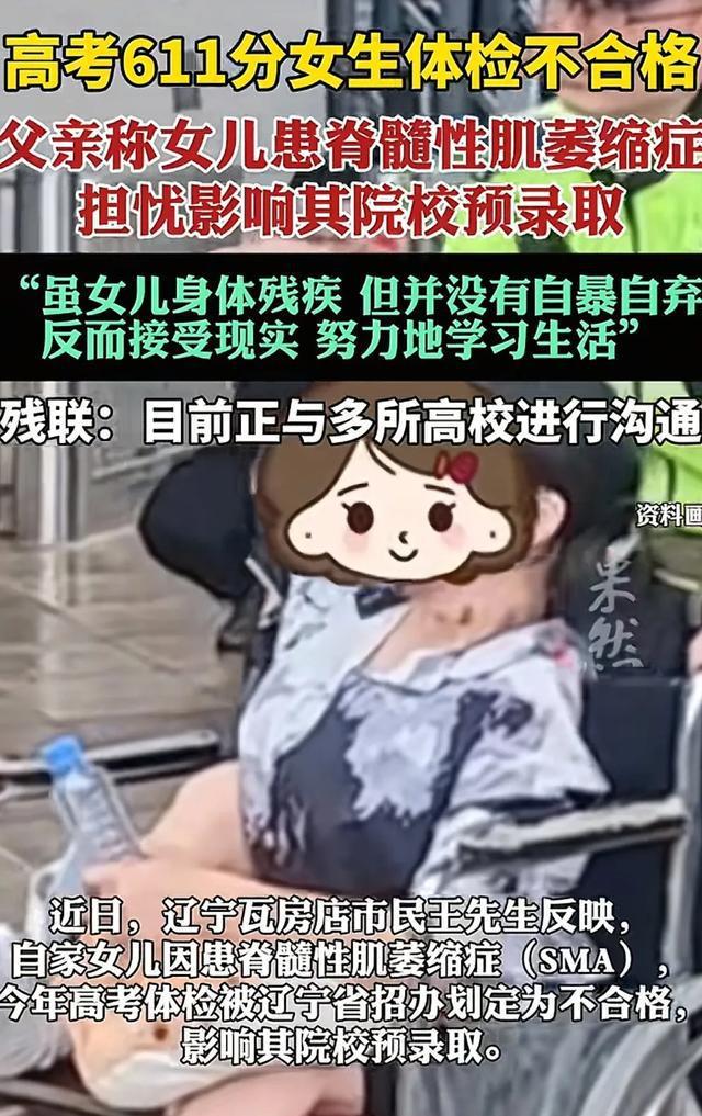 611分体检没过影响入学女生家属发声。近日,辽宁一女生高考取得611分的好成绩,但因身患脊髓性肌萎缩症高考体检不合格,将影响其院校预录取的事情,引发大家的关注和热议。