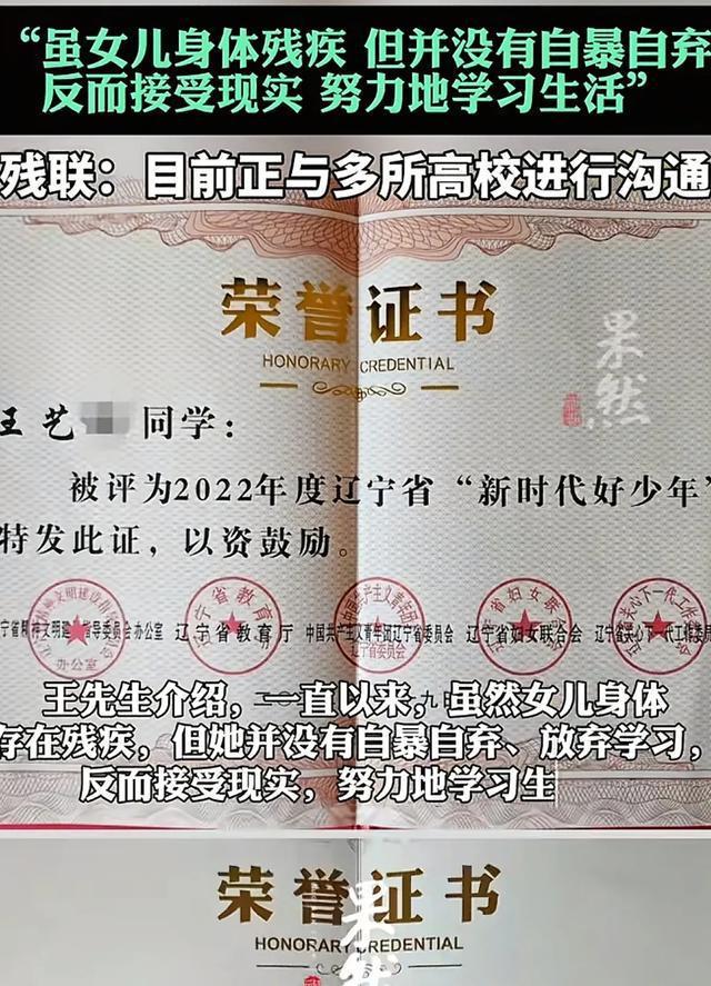 王艺的父亲说,孩子从小就很努力,从没有因为自己的情况而抱怨,而是刻苦学习,获得了很多证书;