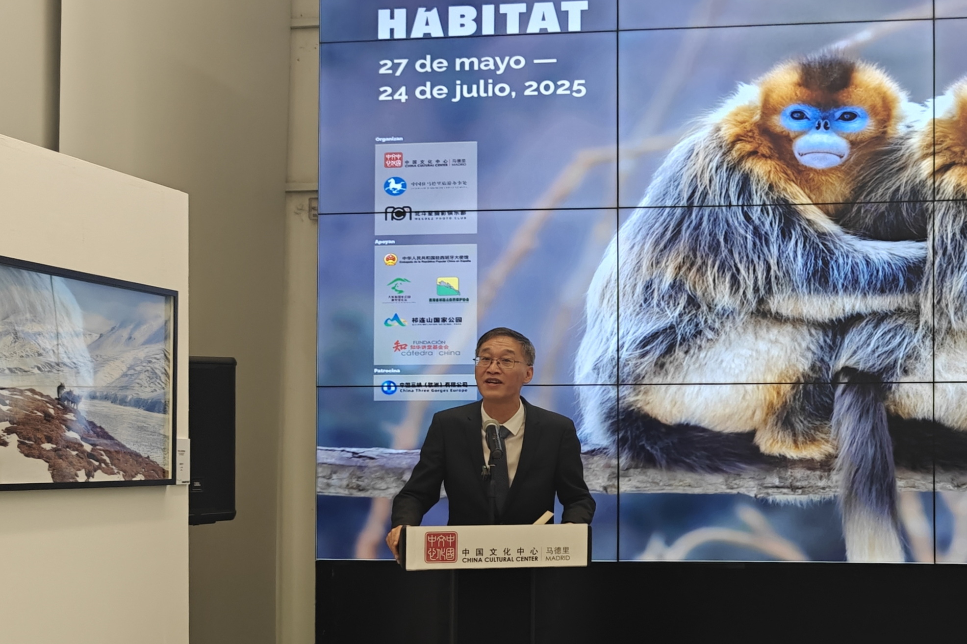 中国驻西班牙大使姚敬在摄影展上致辞。中国驻西班牙大使馆供图