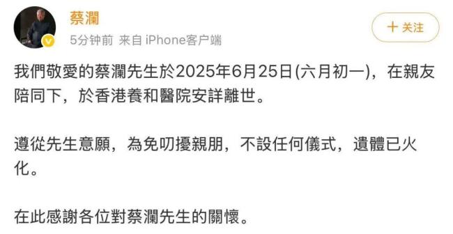6月27日,作家蔡澜在微博上更新消息,宣布蔡澜先生于2025年6月25日在香港养和医院安详离世。为了尊重他的意愿,没有举行任何仪式,遗体已经火化。