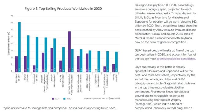 在全球药品销售额TOP10预测名单中,GLP-1产品占据了一半席位,包括Mounjaro(替尔泊肽)、Zepbound(替尔泊肽)、Ozempic(司美格鲁肽)、Wegovy(司美格鲁肽)和Cagrisema。