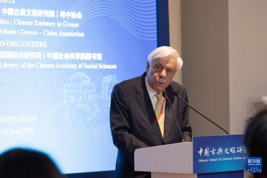 6月26日,在希腊雅典,雅典科学院院士、希腊前总统普罗科皮斯·帕夫洛普洛斯在研讨会上发言。新华社发(莱夫特里斯·帕察里斯摄)