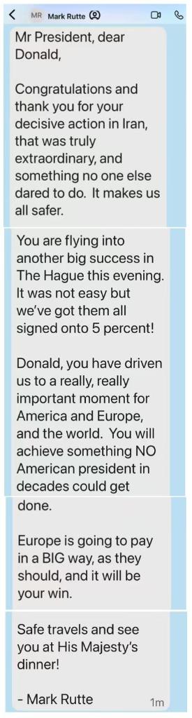 为达成这一成果,吕特在峰会召开前做了大量协调工作,劝说欧洲领导人同意这一计划。特朗普24日在社交平台“真实社交”展示了吕特发给他的短信。吕特在短信中祝贺并感谢特朗普在伊朗的军事行动“让我们更加安全”,并表示特朗普“在海牙将取得另一项重大胜利”。他说,欧洲国家已承诺大幅提高防务支出,“这是欧洲应该做的,这也是你的胜利”。