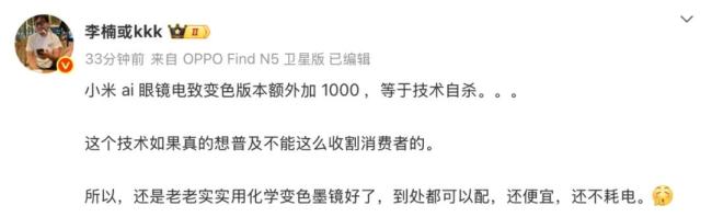 值得一提的是,就在小米AI眼镜第一时间发布后,魅族前高管、Angry Miao创始人李楠在其个人微博表示,“小米AI眼镜电致变色版本额外加1000(元),等于技术自杀,这个技术如果真的想普及不能这么收割消费者的。所以,还是老老实实用化学变色墨镜好了,到处都可以配,还便宜,还不耗电。”