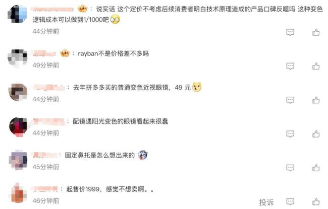 小米没有选择以“极致性价比”的方式切入市场,对于小米AI眼镜1999元的起售价,有网友在微博上评论表示“Meta Ray-ban价格好像差不多”“起售价1999元感觉不想卖啊”;还有网友吐槽其固定鼻托以及电致变色的设计。
