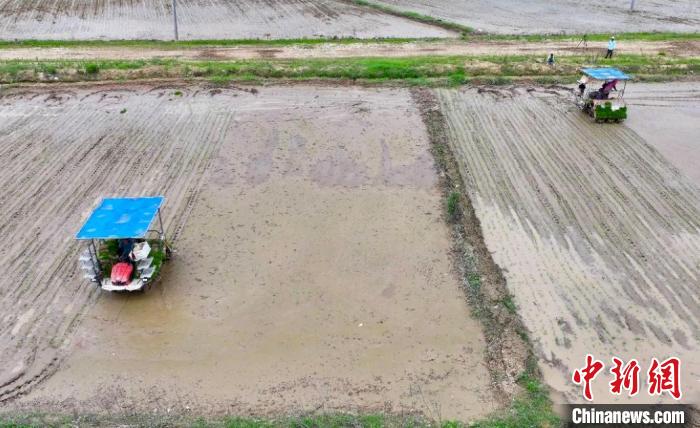 中新网南昌6月30日电(卢梦梦 骆道明 贺登毅)眼下,正值中稻插秧的黄金时节。赣鄱大地的田间地头,呈现出一派热火朝天的繁忙景象,农户们正抢抓农时,积极开展中稻插秧工作。