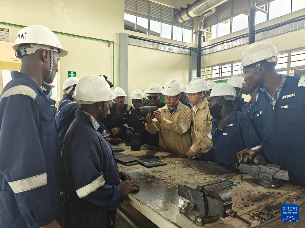 6月11日,在乌干达基贡巴石油学院,中国老师汤海东(中)为学员讲解焊接要点。新华社发(中石化供图)