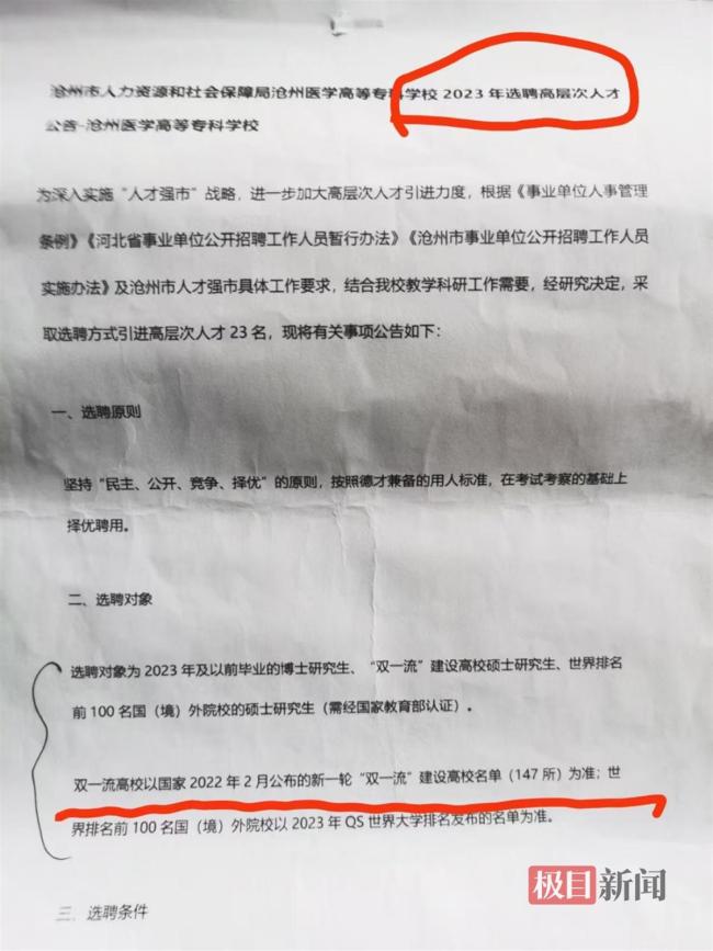 去年底,沧州医学高等专科学校发布了《2025年度高层次人才选聘公告》,选聘对象包括2025年8月底及以前毕业的博士研究生、“双一流”建设高校硕士研究生,以及世界排名前100名国(境)外院校的硕士研究生。其中,“双一流”高校以2022年2月教育部公布的新一轮“双一流”建设高校及建设学科名单为准;世界排名前100名国(境)外院校以2025年QS世界大学排名为准。