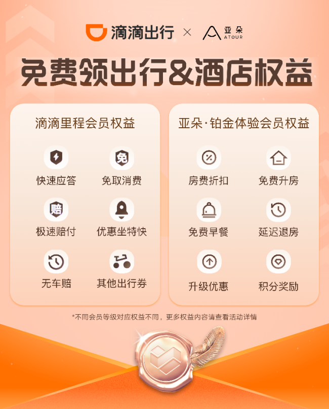 近年来,滴滴出行不断深化与酒旅品牌的合作,此次滴滴出行与亚朵集团开放互通会员体系后,用户仅需简单操作,即能一键免费领取双方联手打造的会员权益。根据各自的会员等级,用户将对应享受定制化的专属权益:滴滴的V5及V6、V7及V8里程会员可分别兑换亚朵金、铂金体验会籍,亚朵的金、铂金会员可对应领取滴滴的V5、V7等级权益。