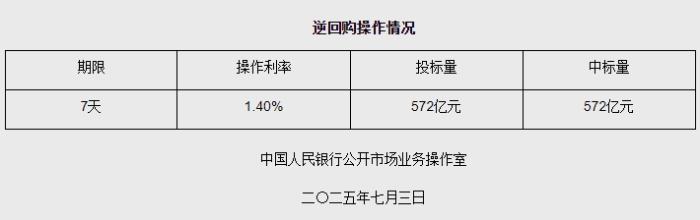 中新网7月3日电 据中国人民银行网站消息,2025年7月3日中国人民银行以固定利率、数量招标方式开展了572亿元逆回购操作。具体情况如下: