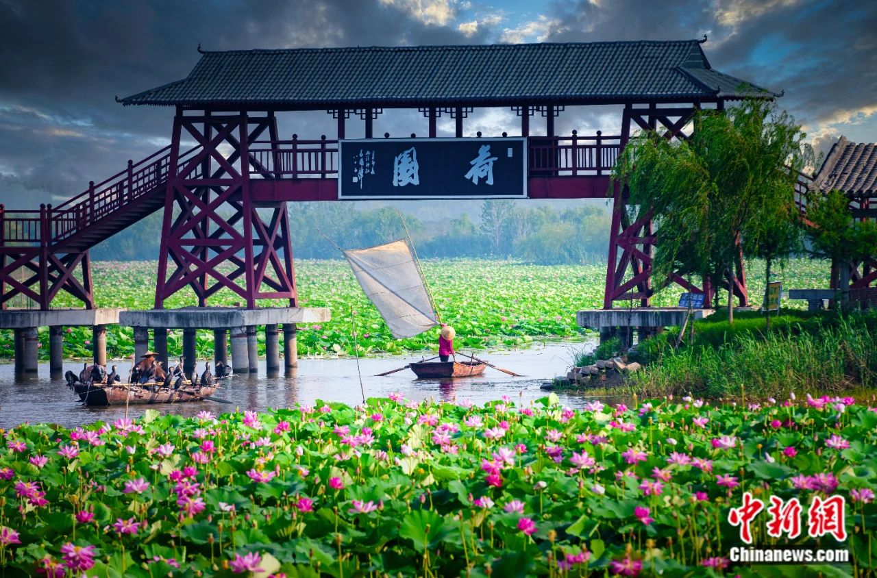 微山湖荷园红荷摇曳。山东省文化和旅游厅供图。