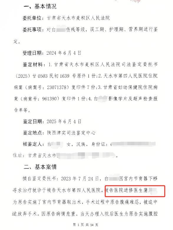 30岁的甘肃女子白女士怎么都没有想到,一次取环手术会让自己踏上两年的维权之路。2023年7月24日,她前往天水市第四人民医院进行取环手术。考虑到手术风险,她起初希望由妇科主任操作,后在护士推荐下选择了马医生。手术同意书由马医生签字,并告知了相关风险。院方当时还安抚称医生经验丰富。