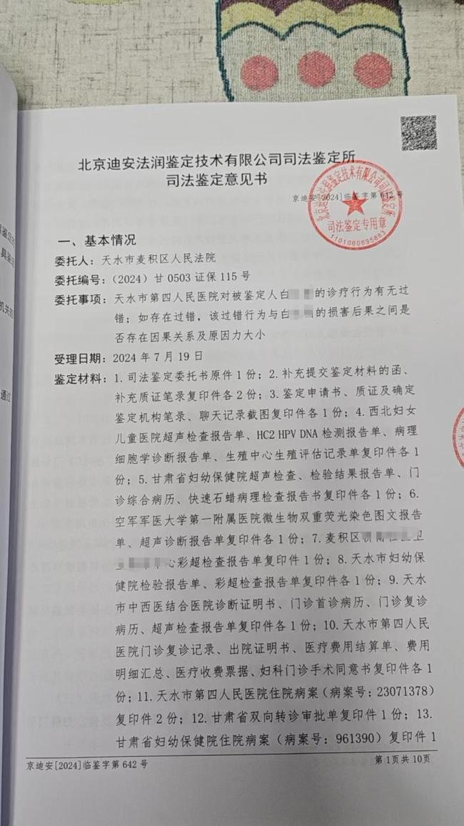 白女士透露,为自己进行手术的蒲医生是天水市麦积区中滩卫生院的医生,目前仍旧在职工作。司法鉴定意见书显示,院方存在过错行为,与白女士损害后果存在因果关系,且“原因力大小建议为主要原因”。