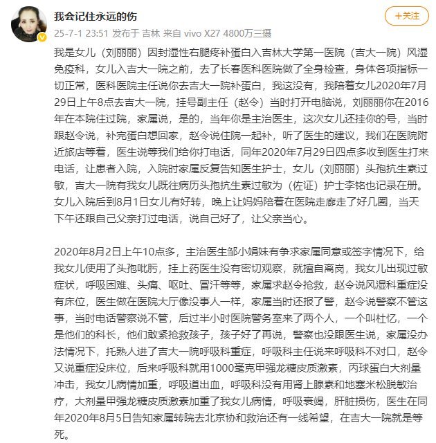 张女士回忆事发经过:在家属多次告知医生护士刘丽丽有头孢类药物过敏病史的情况下,医生仍为其注射头孢吡肟。注射后,刘丽丽病情加重,院方并未及时救治。入院时家属反复告知医生护士,女儿对头孢抗生素过敏,吉大一院也有既往病历佐证,护士李铭也记录在册。2020年8月2日上午10点多,主治医生邹小娟没有征求家属同意或签字情况下,给刘丽丽使用了头孢吡肟。挂上药后,医生没有密切观察,擅自离岗,刘丽丽出现过敏症状,呼吸困难、头痛、呕吐、冒汗等。家属请求副主任赵令抢救,但赵令说没有床位,医生坐在医院大厅像没事人一样,半小时后才开始抢救孩子。