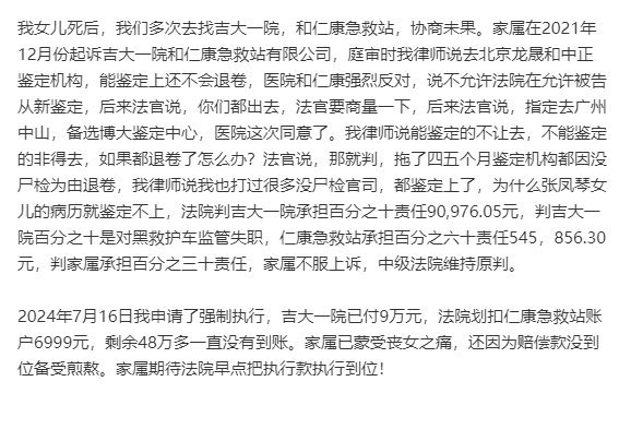 事发后法院判吉大一院承担百分之十责任,赔偿90,976.05元,因其对黑救护车监管失职;仁康急救站承担百分之六十责任,赔偿545,856.30元;家属承担百分之三十责任。家属不服上诉,中级法院维持原判。张女士申请了强制执行,吉大一院已付9万元,法院划扣仁康急救站账户6999元,剩余48万多一直没有到账。家属已蒙受丧女之痛,还因为赔偿款没到位备受煎熬,期待法院早点把执行款执行到位。