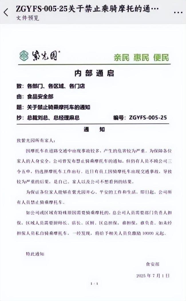 近日,一份紫光园《关于禁止乘骑摩托的通知》在网上流传,引起广泛关注。通知中提到,“如未经担保人员私自骑乘摩托车,一经发现,将给予相关人员负激励10000元起。”该通知的落款时间为2025年7月1日,原因是“公司曾发布禁止骑乘摩托车的通知……近日有员工因骑摩托车出现交通事故,导致较为严重的后果”。
