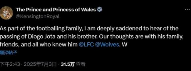 在若塔兄弟因车祸离世后,威廉王子和凯特王妃通过共同的社交媒体账号表达了哀悼之情。他们在社交媒体上写道:“作为足球大家庭的一员,听闻迪奥戈-若塔及其兄弟不幸去世的消息,我们深感悲痛。我们与他的家人、朋友以及所有认识他的人同在。”