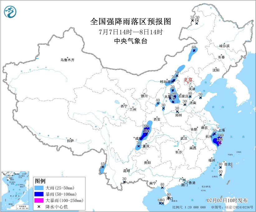 中新网7月7日电 据中央气象台网站消息,中央气象台7月7日10时继续发布暴雨蓝色预警:预计,7月7日14时至8日14时,浙江中东部、内蒙古中部和东北部、山西中东部、河北西北部和西南部、山东北部、河南北部、陕西中部和西南部、四川东部、云南西部、海南岛西南部、台湾岛西部等地部分地区有大到暴雨,其中,浙江东部、四川东北部等地局地有大暴雨(100~200毫米)。上述部分地区伴有短时强降水(最大小时降雨量20~50毫米,局地可超过70毫米),局地有雷暴大风等强对流天气。