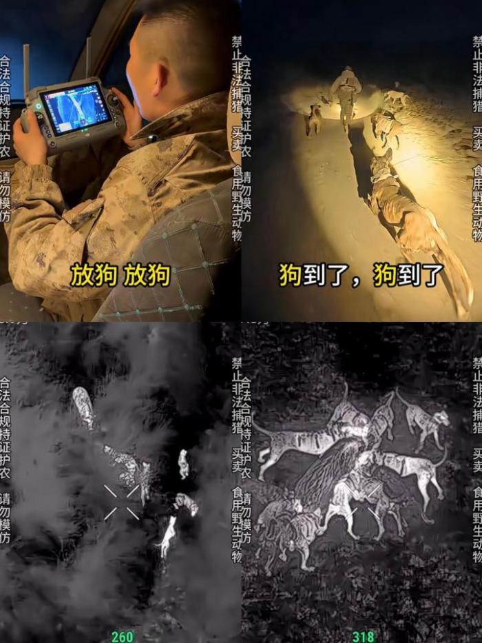 一天晚上,有老乡告诉刘军强,附近地里可能有七八只野猪,等他到现场用无人机看才发现,“一串串”野猪大摇大摆下山闯向麦田,数量有好几十只,13只猎犬迅速一拥而上展开混战,抓完一个又去扑另一个,那晚,他们一口气驱赶了21只野猪。