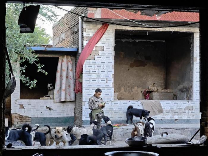 一踏进“六盘强子护农队”的小院,守在门口的几十只猎犬开始集体狂吠,发出警觉的怒吼。优秀的猎犬难遇,刘军强一开始花了十几万购买专业猎犬,后来自己繁育,培养成现在的汪汪工作队。他给每只狗狗都取了名字,给它们安排“四班倒”上岗。
