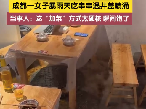 7月4日成都暴雨期间,一女子与朋友吃串串时,餐桌旁井盖突然喷涌,污水杂物随雨水翻出。当事人称“瞬间没食欲了”,被困原地无法离开。