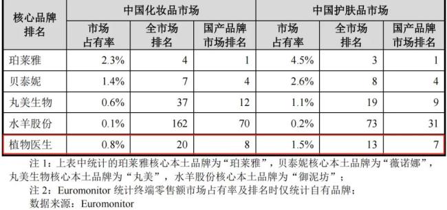 以2024年的零售额计,植物医生在中国化妆品市场国产品牌中排名第八;在护肤品市场国产品牌中排名第七,市占率分别为0.8%和1.5%,并不算特别突出。