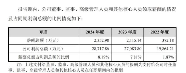 但管理层的涨薪表现相当抢眼。2022年,公司董监高的薪酬总额为372.18万元,占当期利润总额的1.87%,2023年和2024年,猛增至2115.14万元和2352.98万元,占到了各期利润总额的7.81%和8.19%。