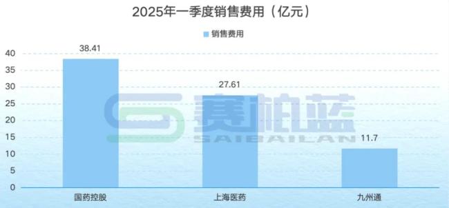 2025年一季度销售费用中,国药控股位列三大药商首位,达到38.41亿元;其次是上海医药(27.61亿元)、九州通(11.7亿元)。