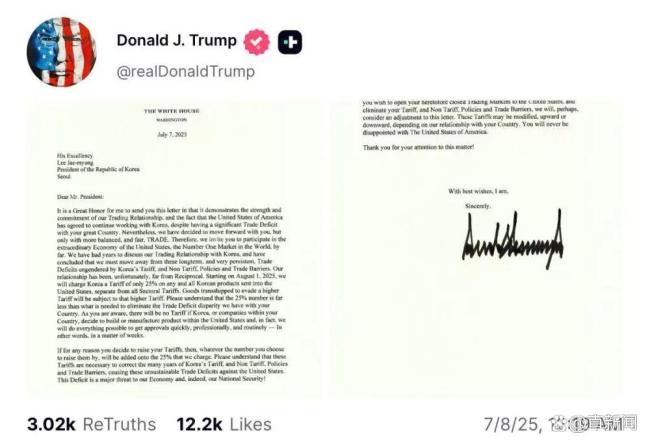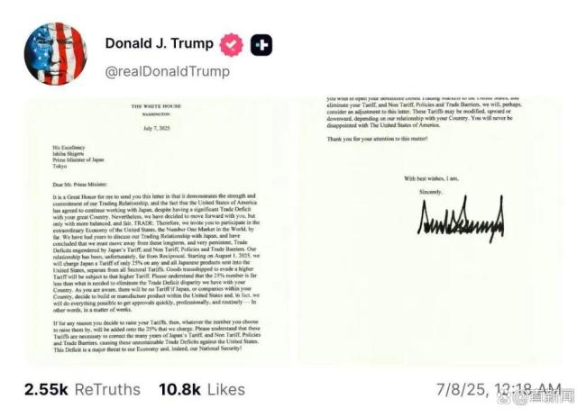 特朗普在自己创立的“真实社交”网站上发布了写给日本首相石破茂和韩国总统李在明的信件,表示新关税不包括其他行业关税。在这些内容几乎相同的信中,特朗普写道:“请理解,25%这一数字远远低于消除我们与贵国之间贸易逆差所需的水平。”他还警告称,如果日韩两国以提高关税作为回应,美国也将在25%的基础上再提高同等额度的关税。