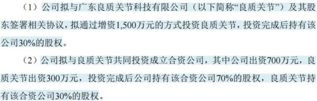 另外,公司拟与良质关节共同投资成立合资公司,其中公司出资700万元持股70%,良质关节出资300万元持股30%。