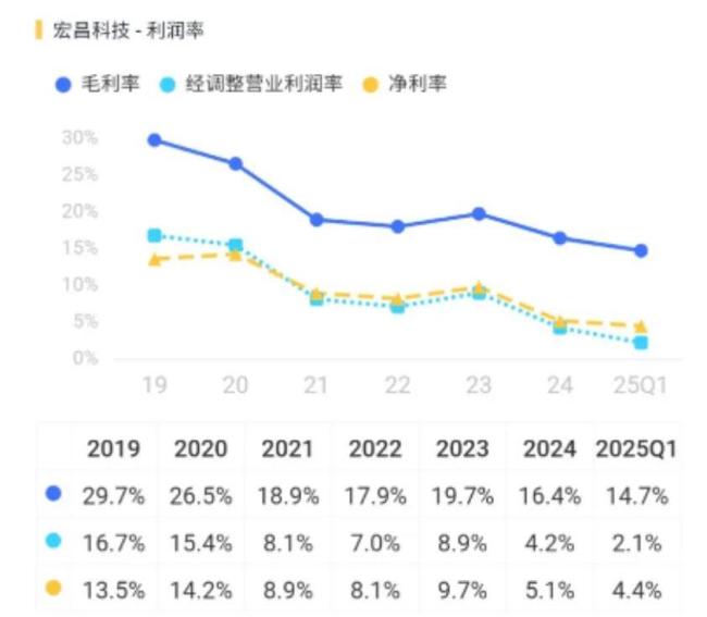 2019年以来公司毛利率持续下滑,2025年一季度已降至14.7%。