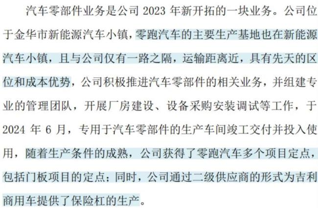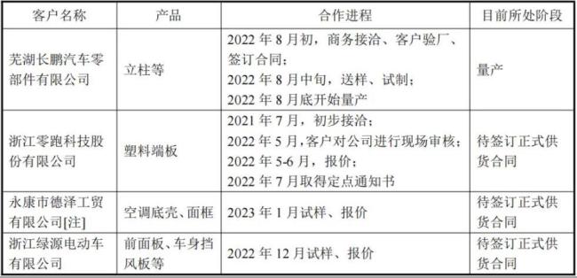 另外,公司注塑件量产客户仅有芜湖长鹏汽车零部件有限公司(零跑供应商)一家,公司虽然取得了零跑汽车的项目定点,但尚未签订正式供货合同。