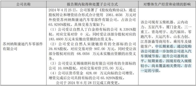 2024年4月,公司通过股权转让和增资相结合的形式,以2061万元拿下苏州纳斯康迪汽车零部件有限公司(标的公司)65.9%的股权。